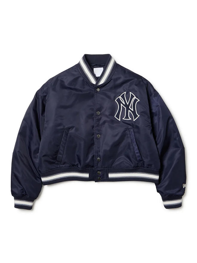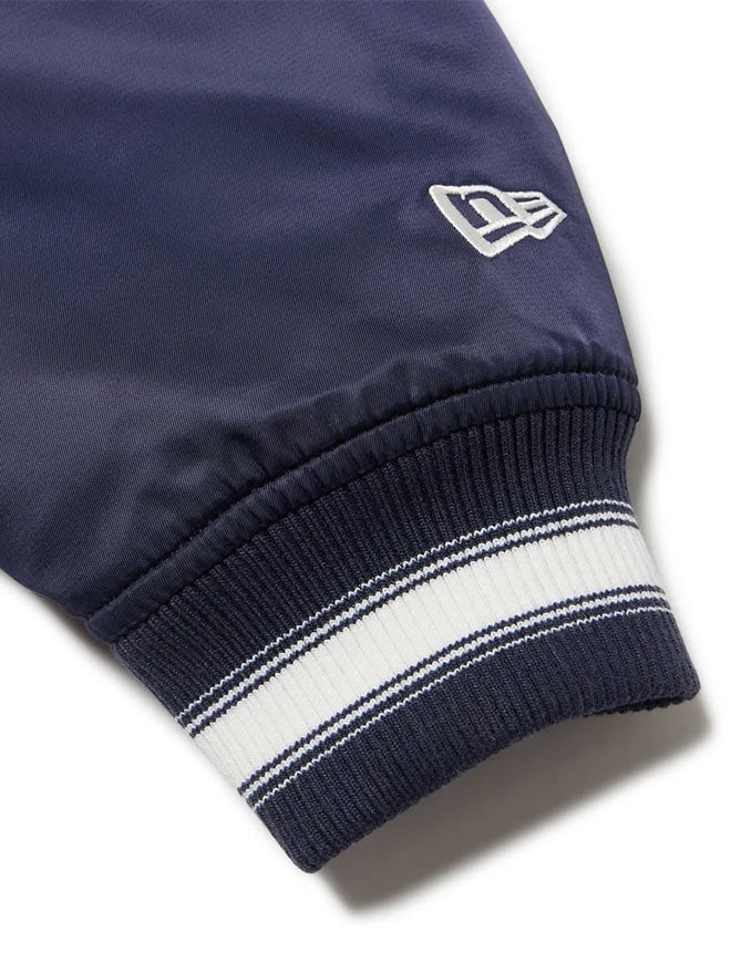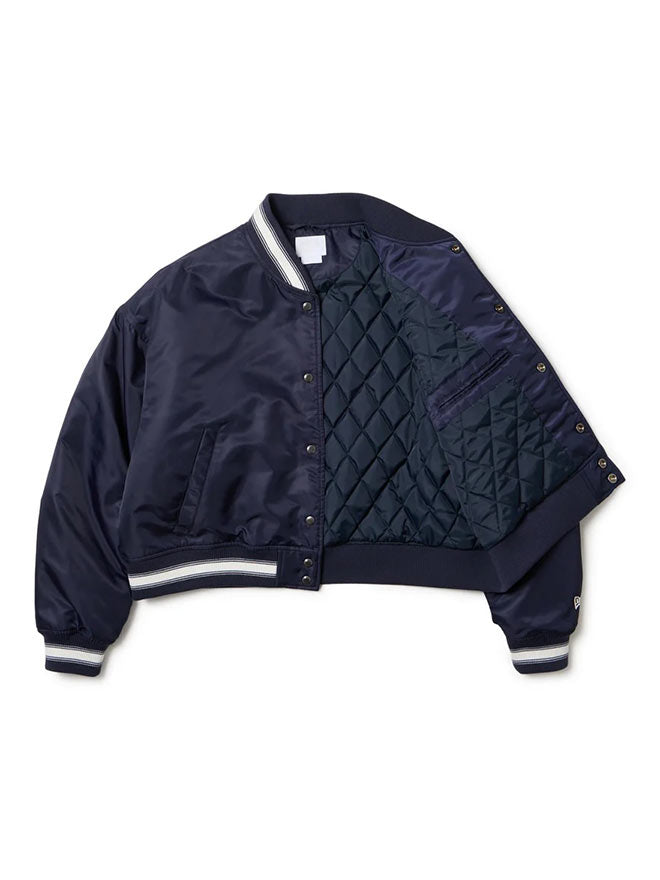 ニューヨーク・ヤンキースをモチーフにした、New Era(ニューエラ)のウィメンズ・バーシティージャケット。光沢のあるブラックのナイロン素材に、胸元の「NY」ロゴ刺繍が映える上品かつクールなデザインです。やや短めの丈感で女性らしいバランスを保ちつつ、クラシックなスタジアムジャケットのスタイルを現代的にアレンジ。襟・袖口・裾のリブにはホワイトのラインを配し、全体をスタイリッシュにまとめています。スナップボタン仕様で着脱もスムーズ。軽量かつ防風性のある素材で、秋から春にかけてのライトアウターとして最適です。
