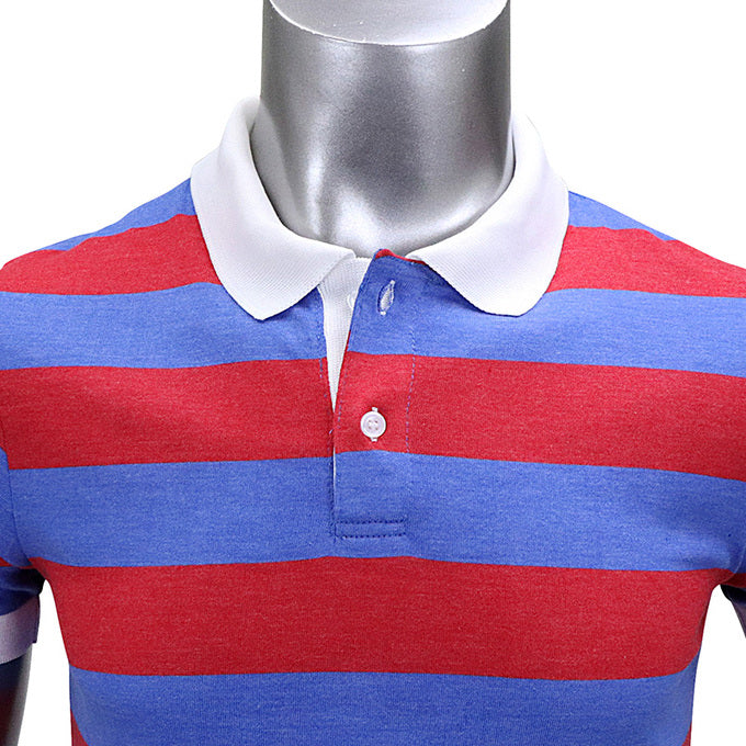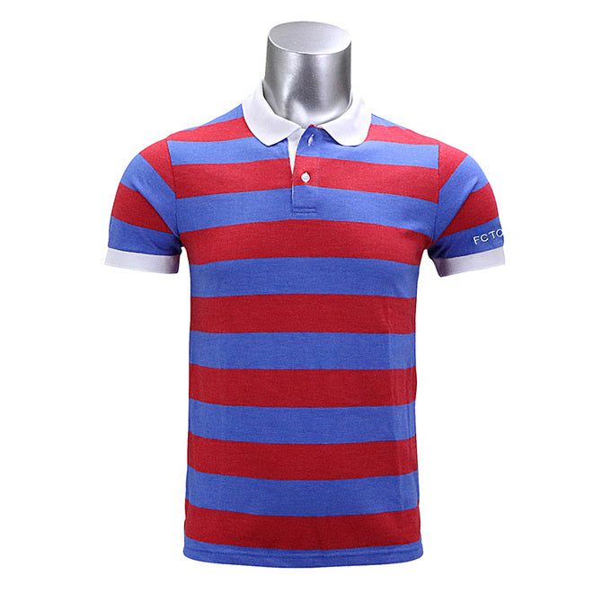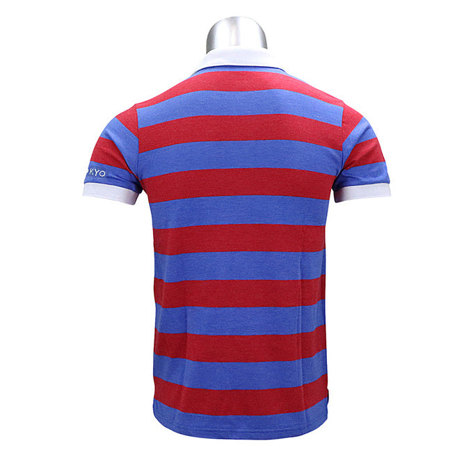 FC東京チームカラーの青赤ボーダー柄ポロシャツ。