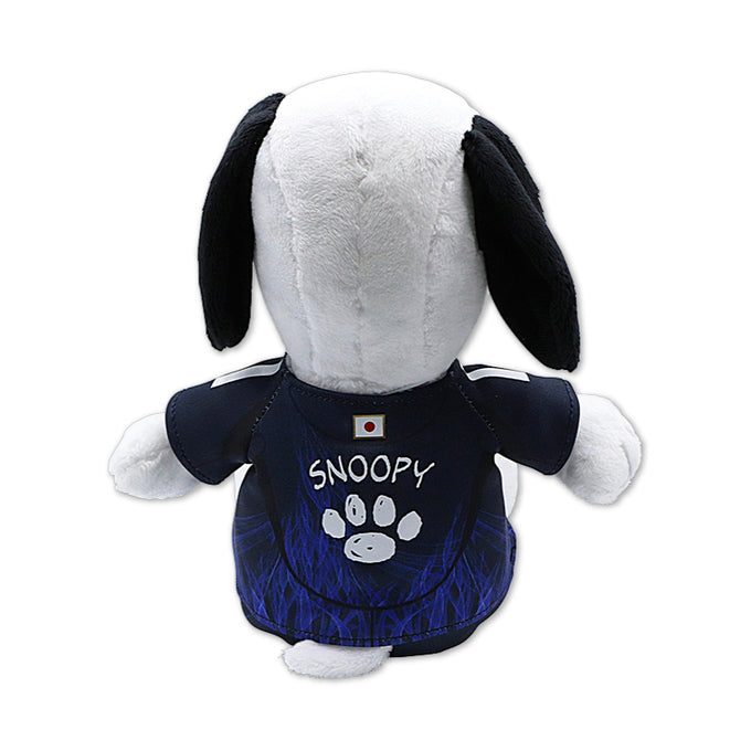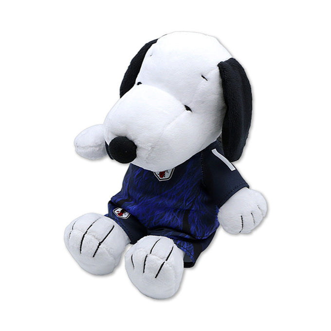 サッカー日本代表のホームユニフォームを着たスヌーピーのぬいぐるみです。