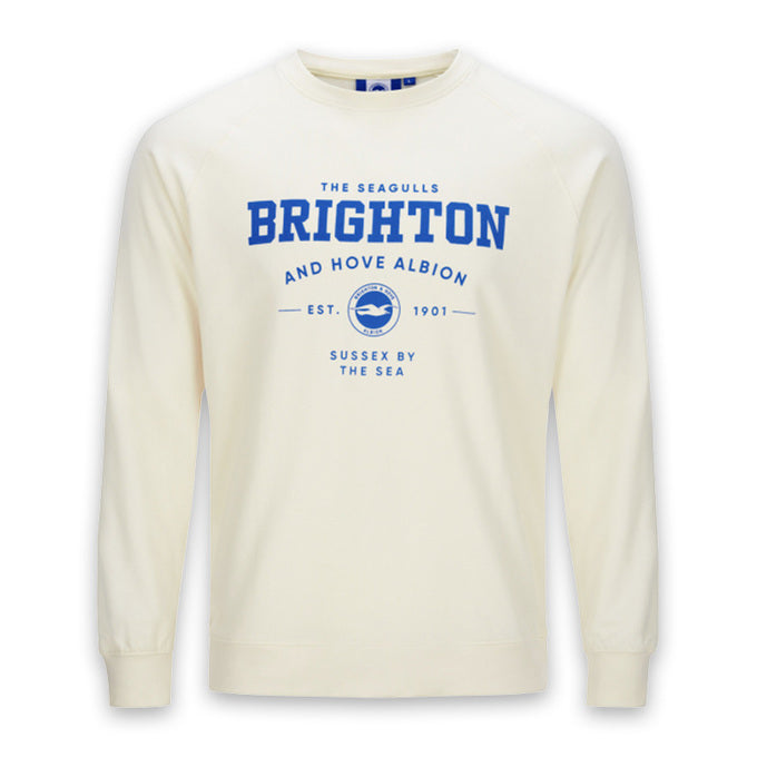 中央にブライトンのクラブエンブレムやチーム名がデザインされたスウェットシャツ(オフホワイト)です。
