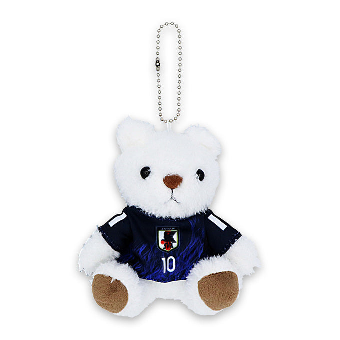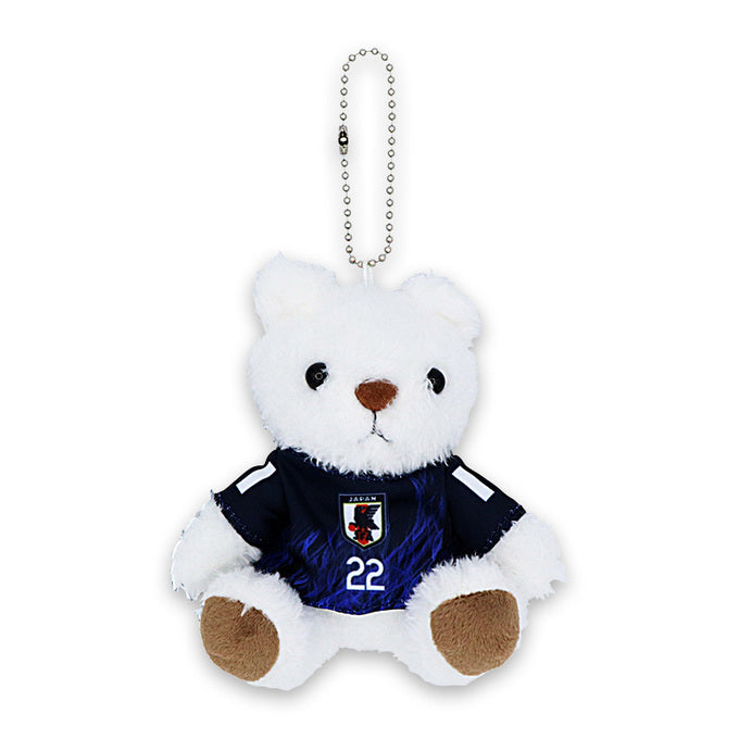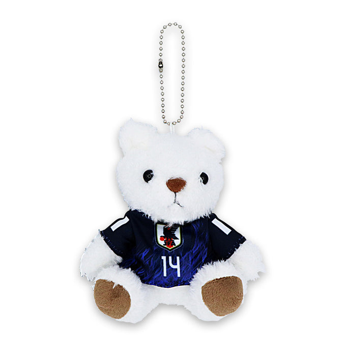 サッカー日本代表のホームユニフォームを着たベアキーホルダーです。