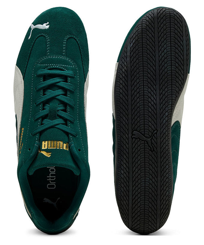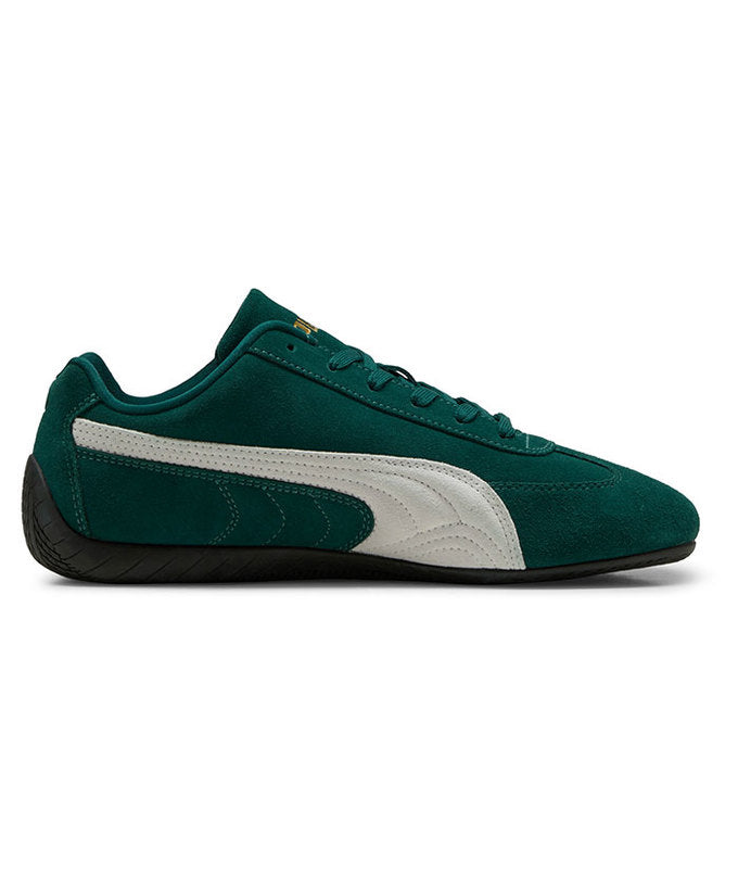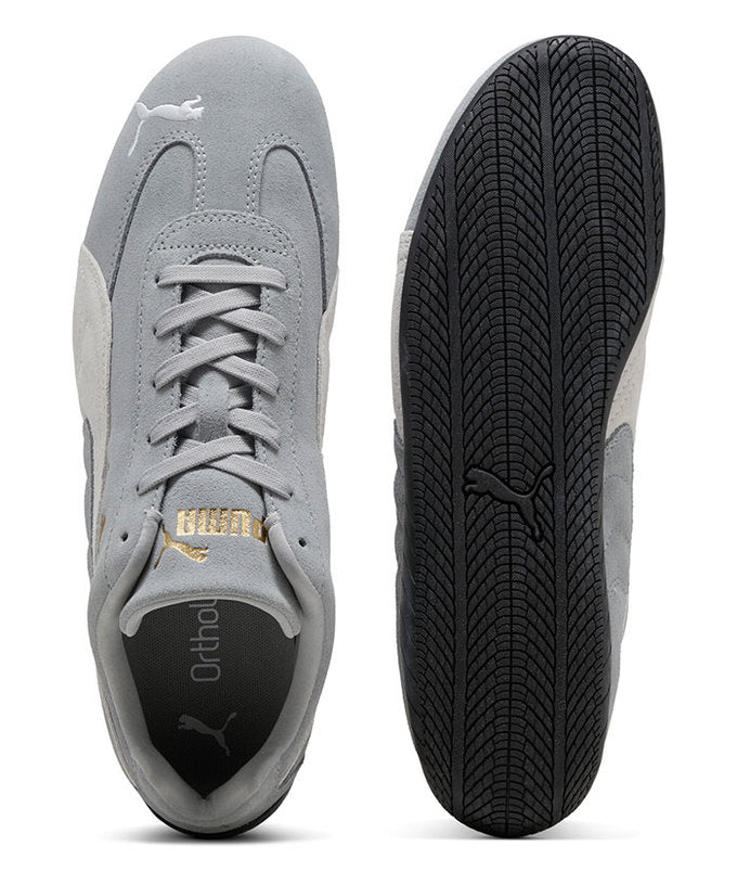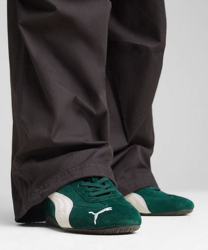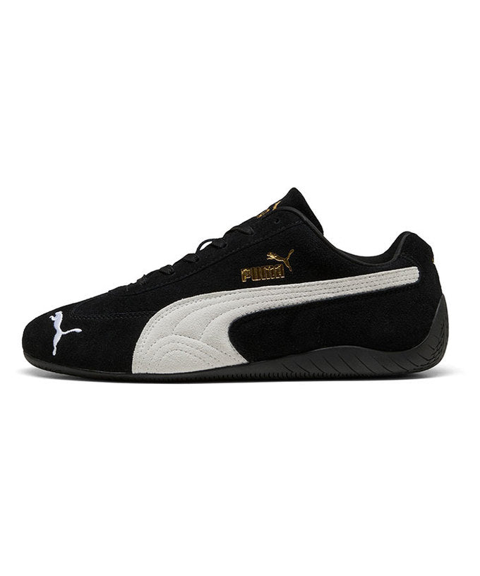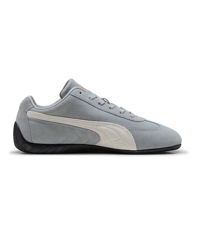 スピードキャットは、1999年に誕生し、80年代から90年代にかけてF1グランプリのドライバーが履いていた耐火レーシングシューズをベースにしたライフスタイルシューズです。レーシングにインスパイアされたなめらかなラインと空気力学に基づいたデザインにより、ファッションやスニーカーカルチャーに衝撃を与えてきました。今回、再びリリースされるスピードキャットOGは、F1レーシングチームを彷彿とさせる豊富なカラー展開とスウェード素材をふんだんに使用した仕上がりとなっています。2000年代初頭のレーシングウェアに敬意を表し、つま先には“プーマキャット”の刺繍が施され、シュータンとフォームストリップの上にはゴールドのロゴがあしらわれています。