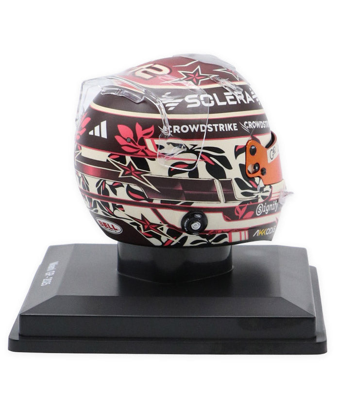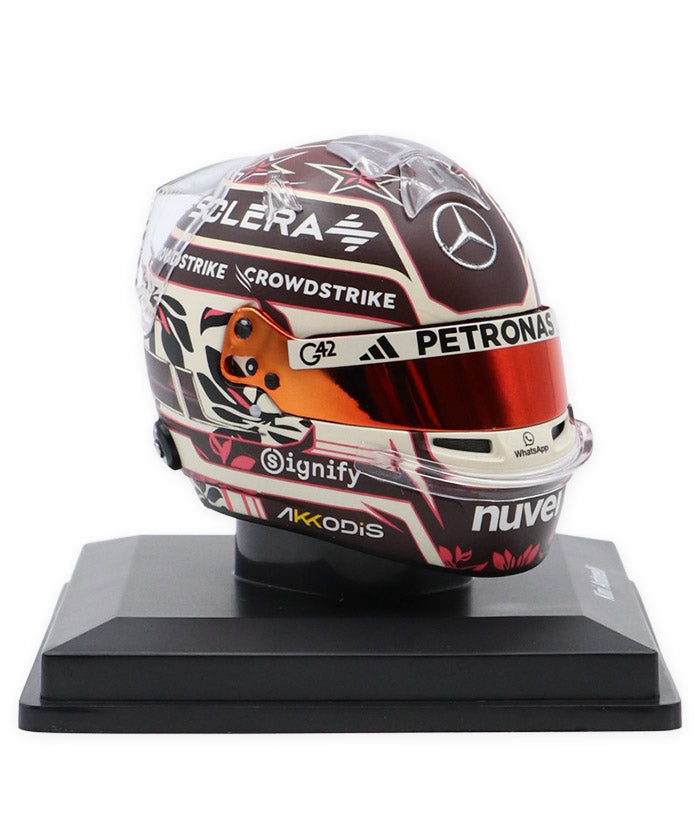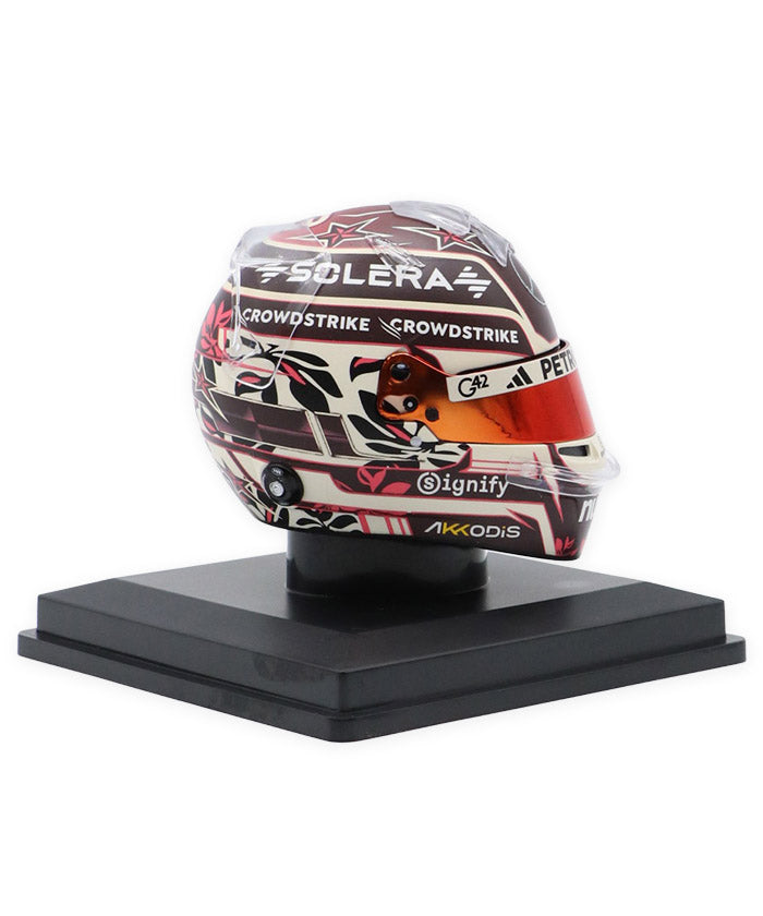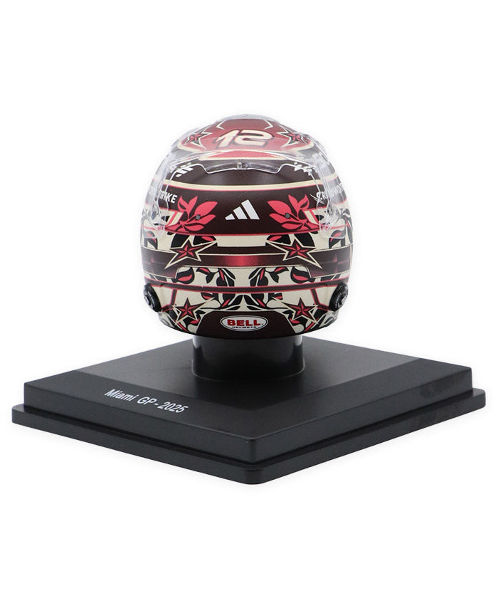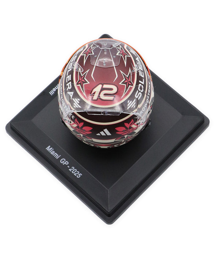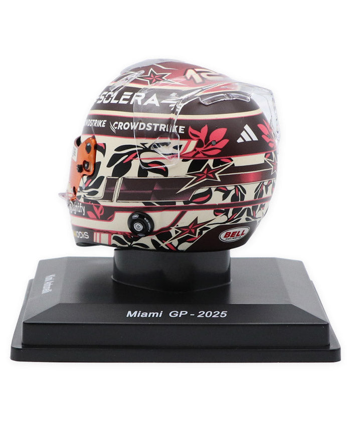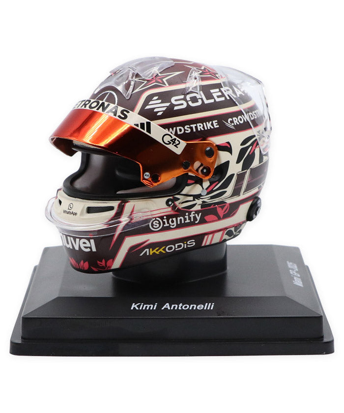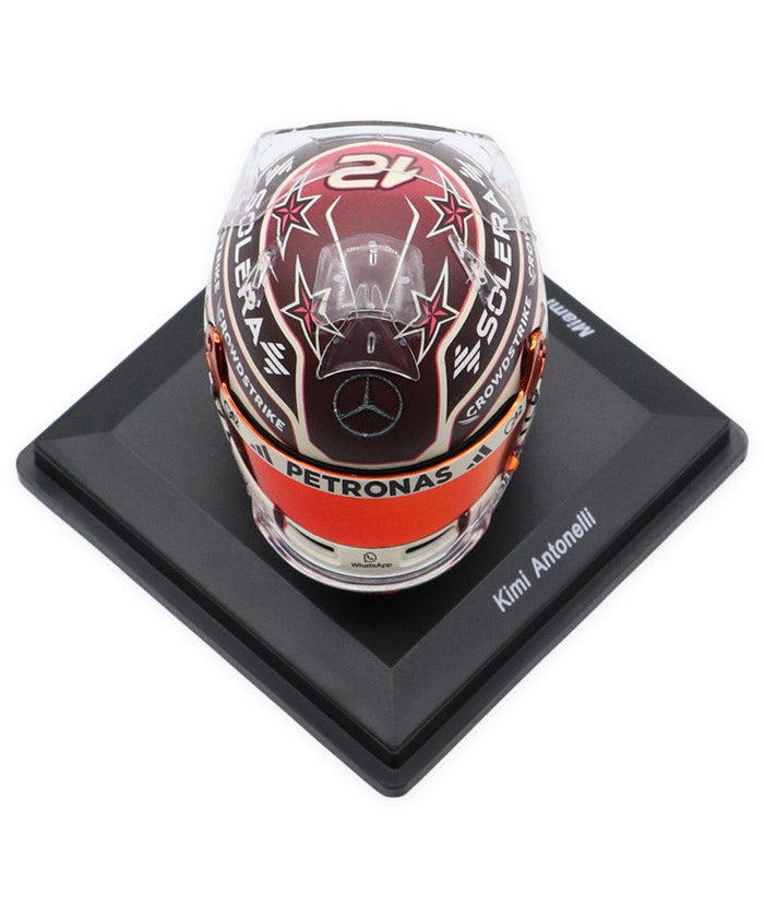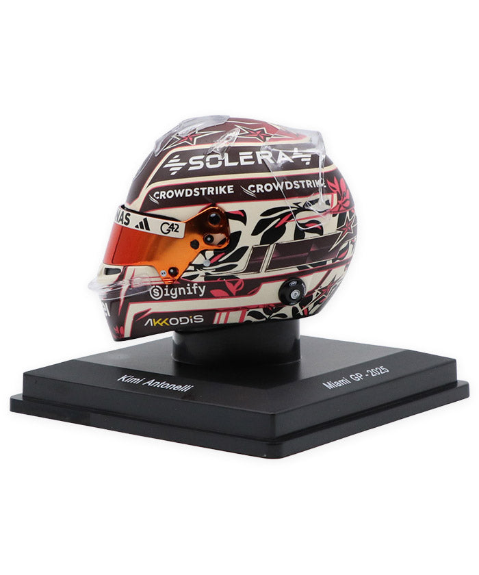 メルセデスの若き才能として注目を集めるキミ・アントネッリのマイアミGP仕様ヘルメット。マイアミらしいポップで華やかな要素を取り入れた特別デザインに、メルセデスAMGペトロナスのチームカラーを基調としたカラーリング、スポンサーロゴやグラフィックまで、実物のディテールを忠実に再現しています。