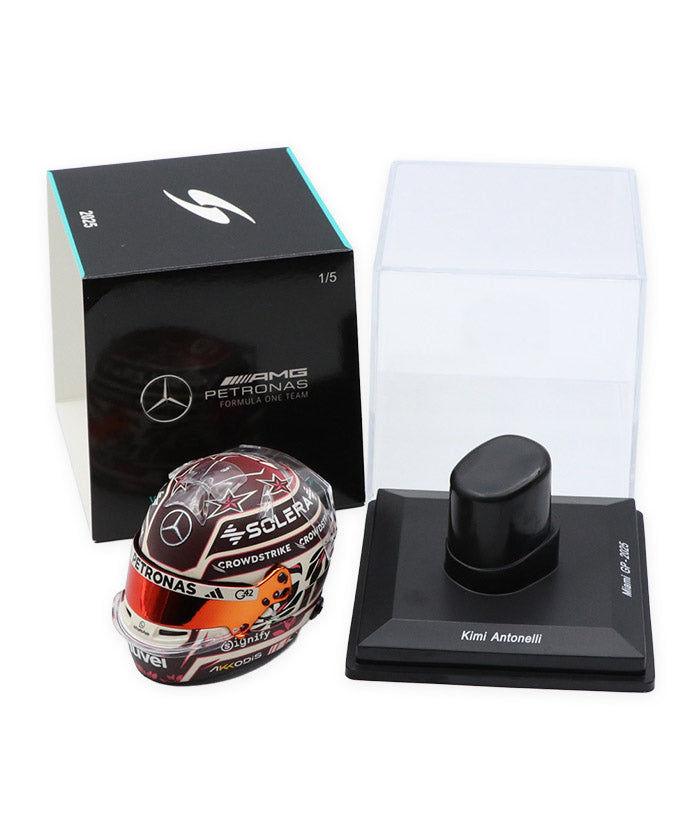 2025年F1マイアミGPでキミ・アントネッリが実際に着用したヘルメットを、スパークが1/5スケールで精密に再現したコレクションモデルです。