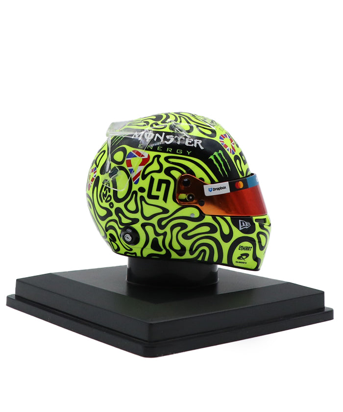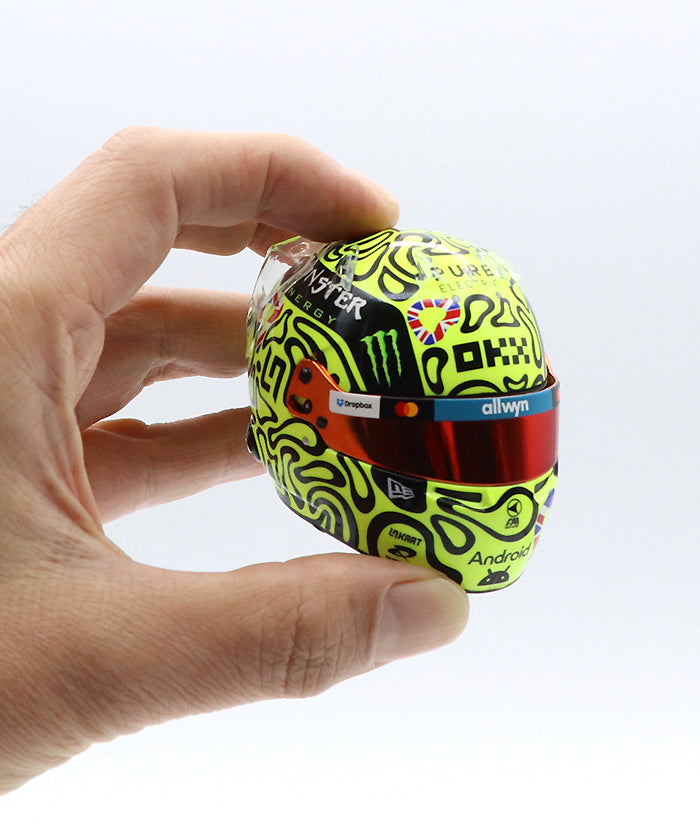 2025年イギリスGPでは、ノリス選手は母国の期待を背負い、序盤から積極的なオーバーテイクを見せるなど注目の走りを披露。ファンを沸かせる迫力のパフォーマンスでマクラーレンにポイントをもたらし、その象徴としてデザインされたヘルメットは、レースの興奮をそのまま感じられる逸品です。