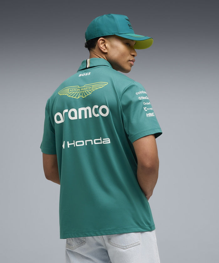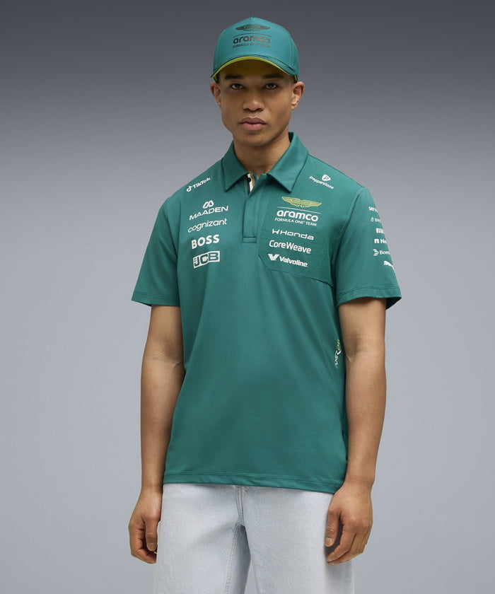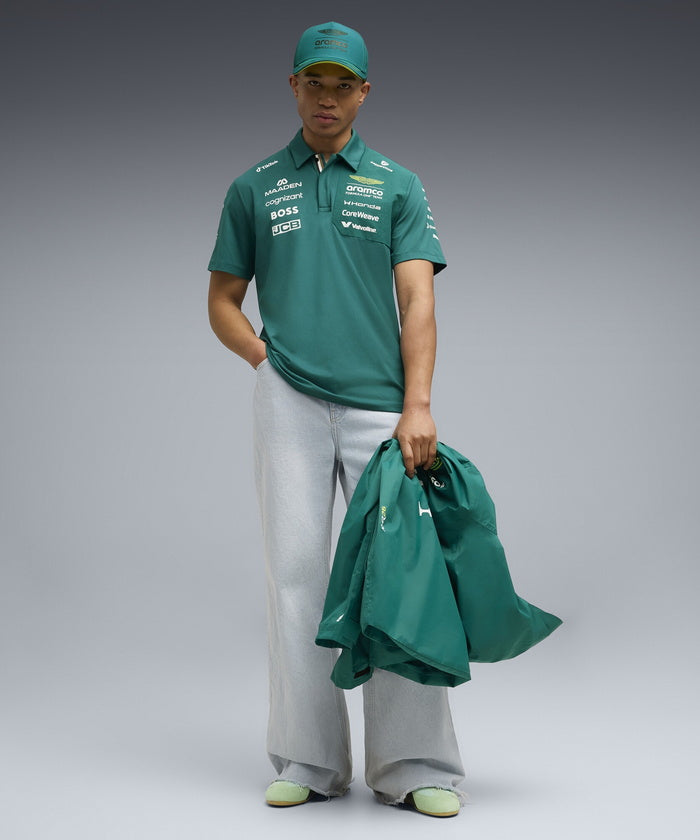 PUMA x ASTON MARTIN ARAMCO F1® TEAM レプリカコレクションは、アイコニックなアストンマーティングリーンにライムカラーのアクセントを組み合わせ、レースデイの高揚感を日常に届けます。このポロシャツは吸汗速乾素材を使用し、2026年 Aston Martin Aramco F1® Team と各パートナーブランドの公式ロゴをあしらったデザイン。