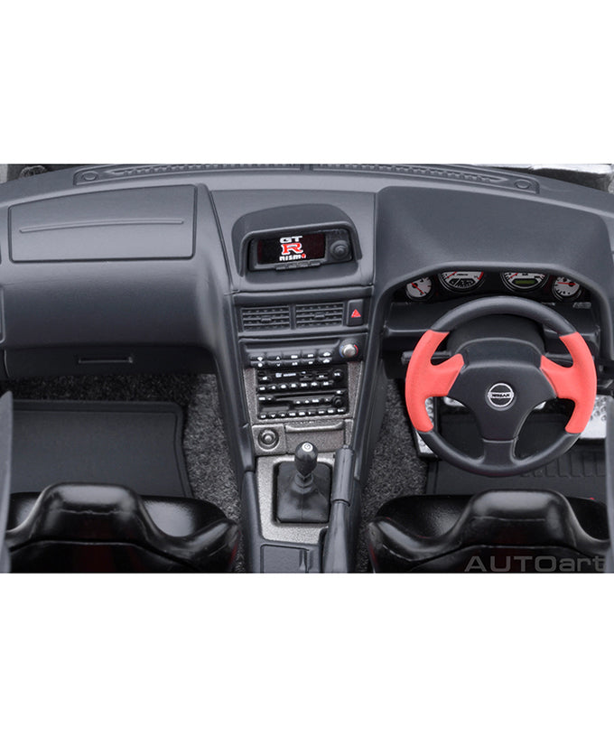 ニスモ創立20周年記念モデル『ニスモ R34 GT-R Z-tune』は、R34型スカイラインGT-Rをベースに、熟練工のハンドメイドによるレース車両同様の工程で製作され2004年から販売されました。500ps以上を発揮する2.8リッターRB26DETT改Z2」エンジンを搭載し当時脚光を浴びたマニア垂涎のスペシャルコンプリートカーです。では、実車を3Dスキャニングし、シャープなボディ形状を可能な限り正確にモデル化。迫力のスタイルを構成するCFRP製フロントバンパー、フロントフェンダー、アウトレット付きボンネットをはじめ、アルミ製大型ラジエターやRAYS製軽量鍛造アルミホイールなど細部まで余すところ無くリアルに再現しました。