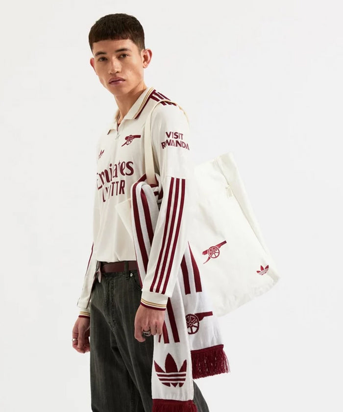 アーセナルの象徴である大砲(キャノン)プリントと、伝説の本拠地ハイベリーにインスパイアされたグラフィックを落とし込んだトートバッグ。