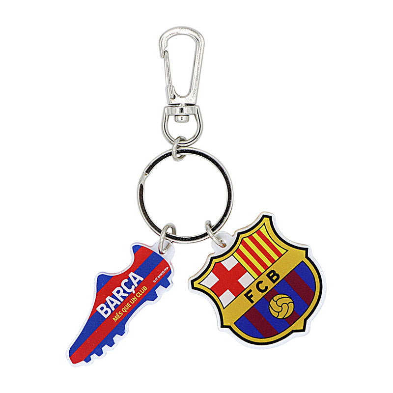 FCバルセロナのクラブエンブレムとシューズのチャームが付いたアクリルキーホルダーです。