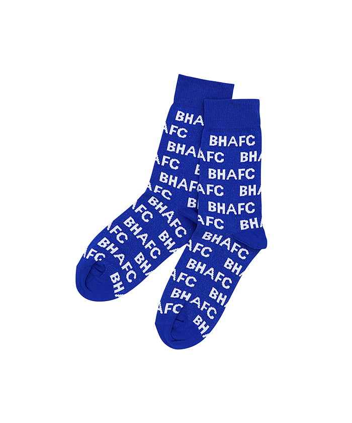 ブルーのベースに鮮やかなホワイトでクラブのイニシャルを全面にあしらったソックスはデイリーユースに最適。爽やかで自信に満ちたデザインです。