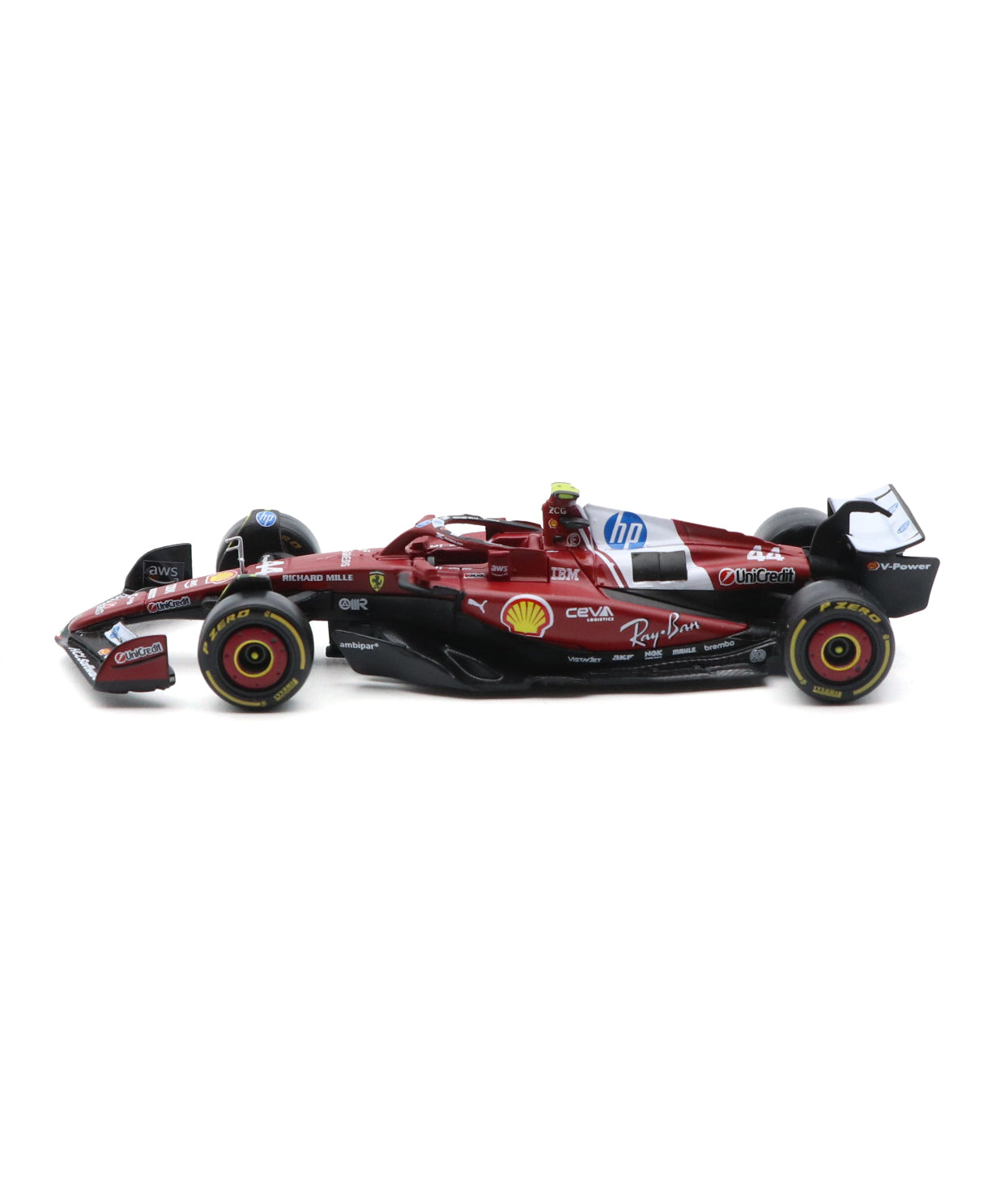 フェラーリらしい深みのあるレッド、力強いライン、ハミルトンのゼッケンやディテールもしっかりと表現されており、飾るだけでシーズンの高揚感が伝わる一台です。