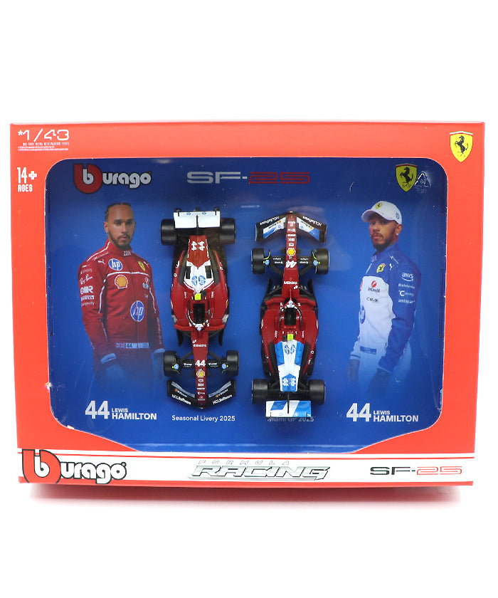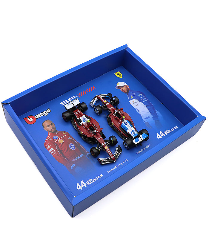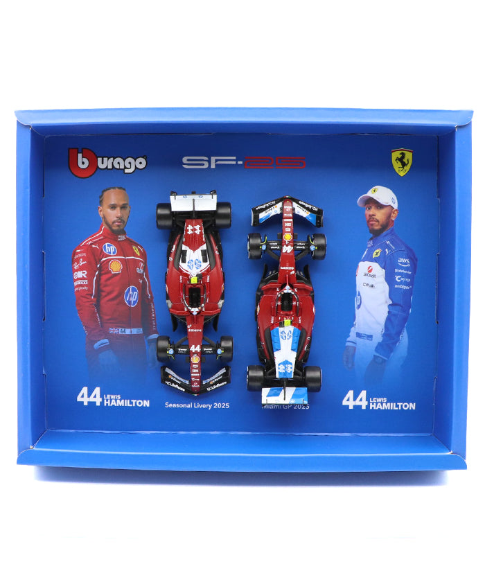 ブラゴ社より、2025年シーズンのフェラーリSF25を駆るルイス・ハミルトンモデルが、1/43スケールの豪華2台セットとして登場しました。レギュラーシーズン仕様のSF25に加え、特別カラーで注目を集めたマイアミGP限定リバリーを収録した、ファン必見のスペシャルセットです。