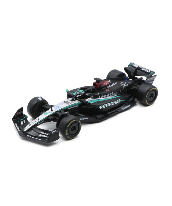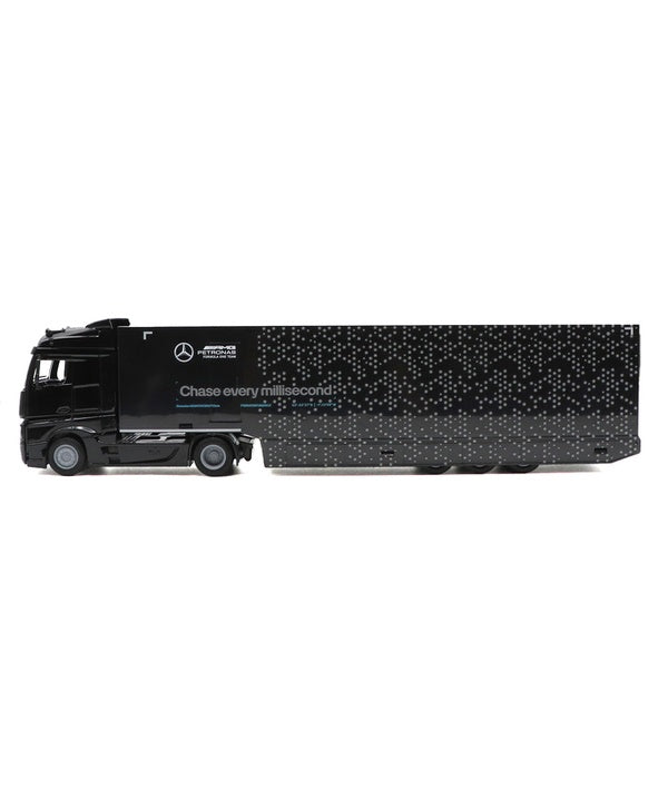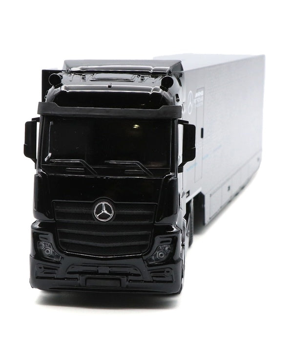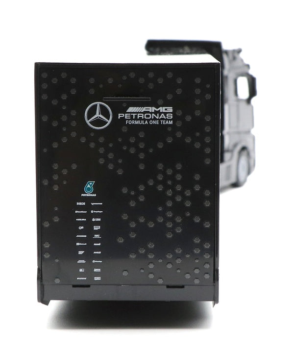 迫力ある1/43スケールの「メルセデス ACTROS GIGASPACE」トランスポーターと、2024年マシン「W15(#63 ジョージ・ラッセル)」がセットになったモデルカーです。