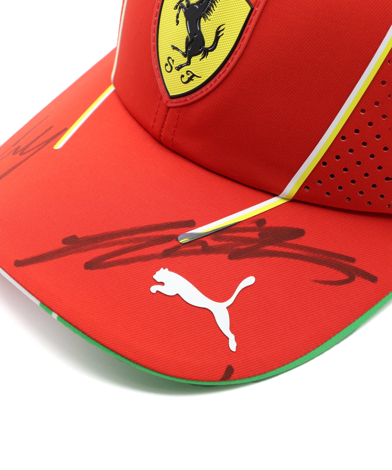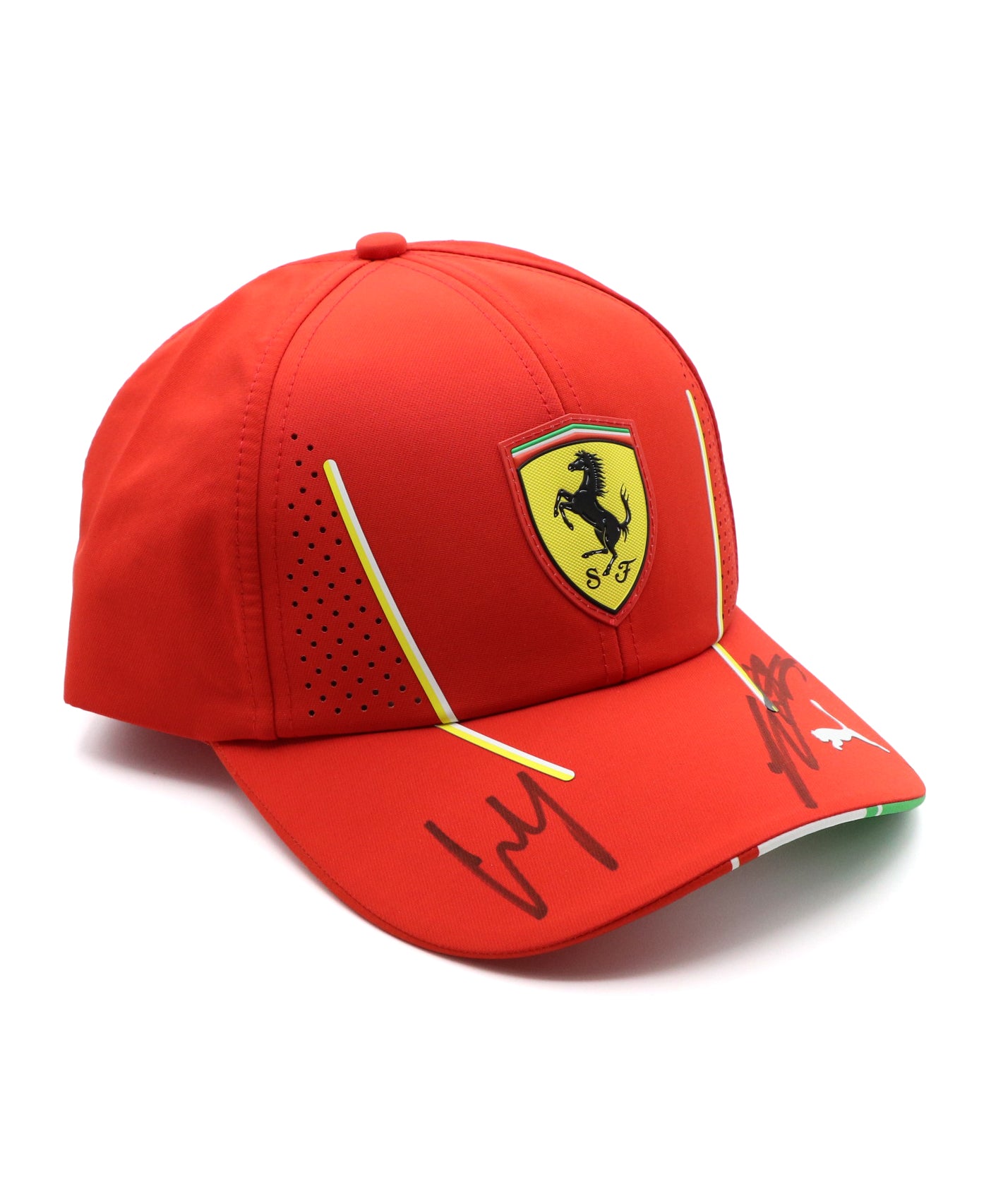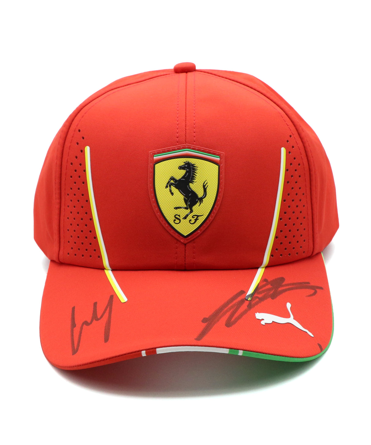 ルクレールとサインツの直筆サインが揃った支給品キャップは入手が極めて困難で、フェラーリファンやF1メモラビリアコレクターにとっては見逃せない一点物。2024年シーズンのフェラーリを象徴する、貴重なコレクターズアイテムです。