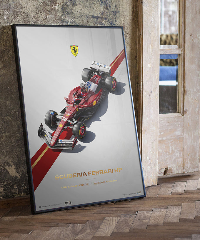 シャルル・ルクレールとルイス・ハミルトンがドライブするSF-25は、フェラーリの大胆な新章を象徴しています。このアートワークは、2025年のカラーリングをまとったマシンを際立たせる洗練されたミニマルな構図で、その章を称えている。エレガントなゴールドのエンボス加工が施され、質感と深みを加え、豪華な仕上がりになっています。