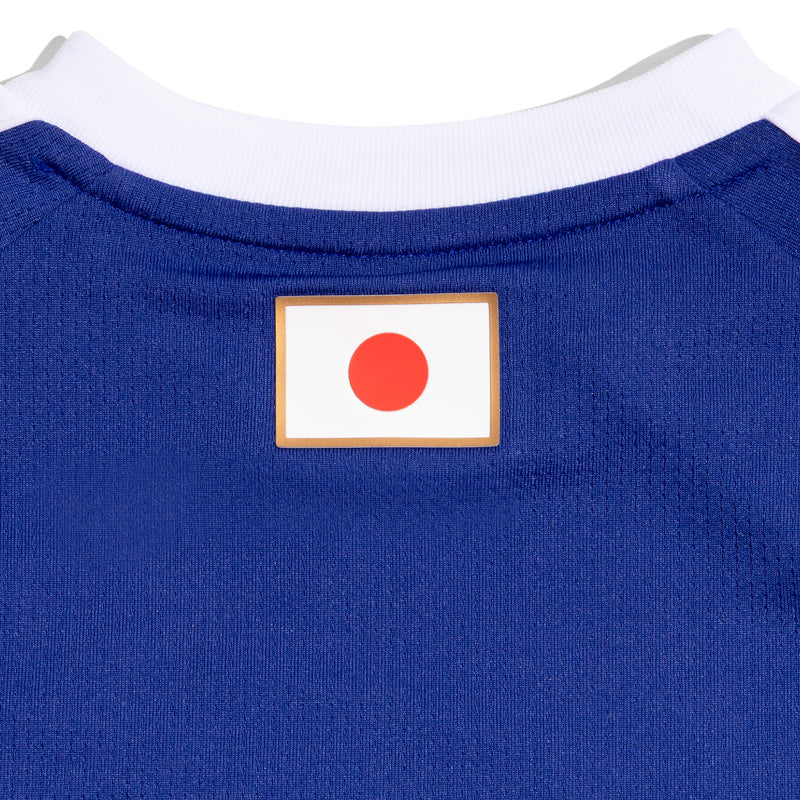 クルーネックラインがクラシックな雰囲気を演出し、スリーストライプスとJFAエンブレムがサッカーへの誇りをアピール。