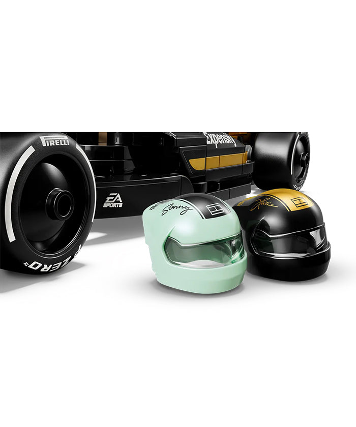 - F1®ドライバーのミニフィギュア2体 – 『F1®/エフワン』に登場した ソニー・ヘイズとジョシュア・ピアースのミニフィギュアは、どちらもサイン入りヘルメット付き