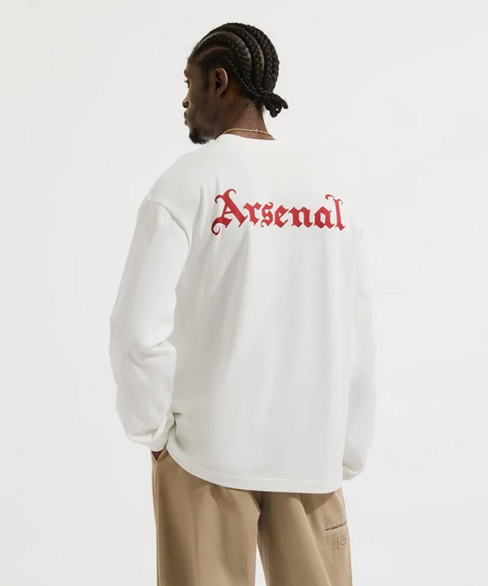 アーセナルのレトロなエンブレムが胸元にプリントされた長袖Tシャツです。 右袖に「Gunners」、背面にゴシックな「Arsenal」が大きくプリントされています。