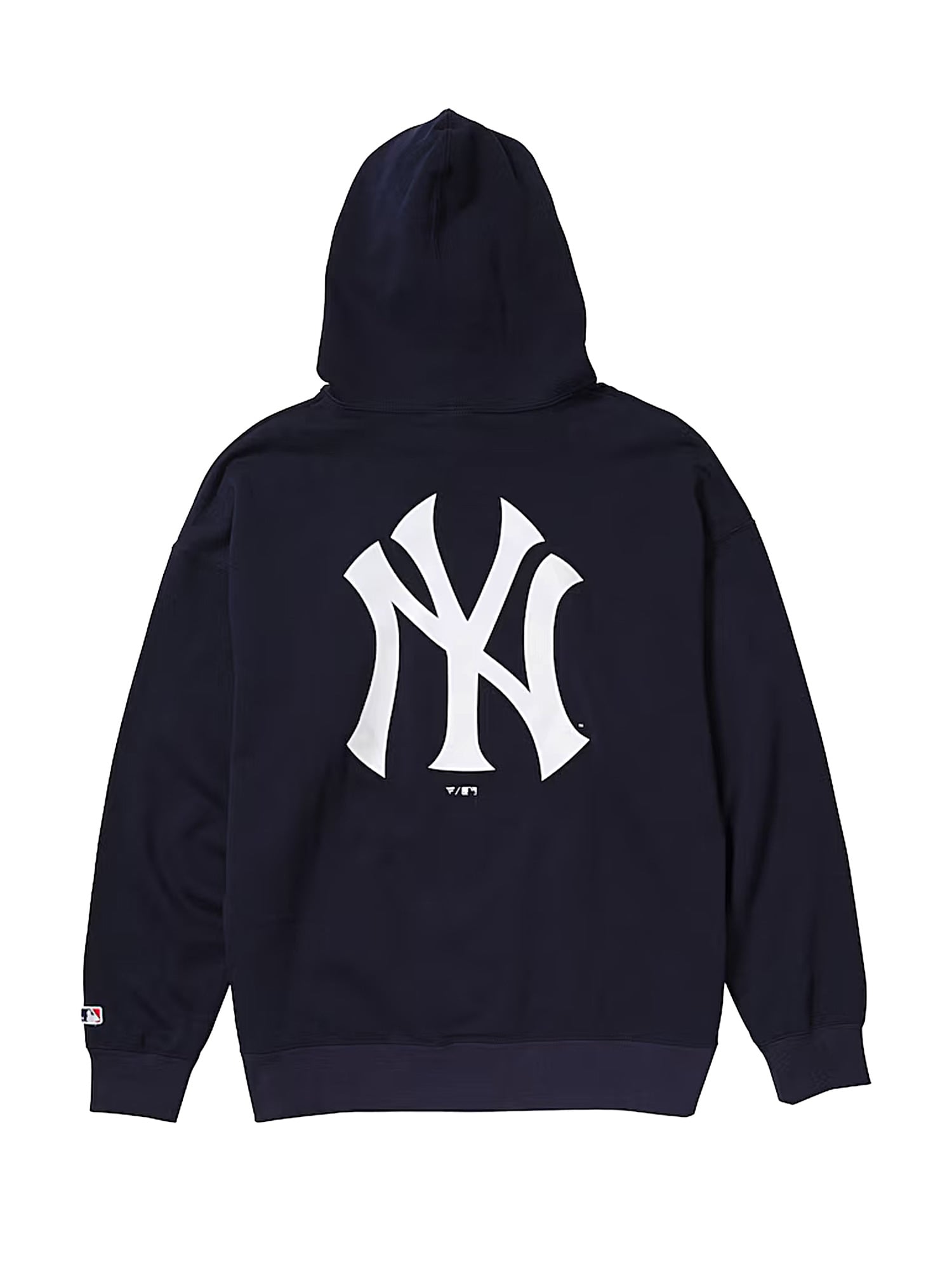 ニューヨーク・ヤンキースの筆記体ロゴをフロントに大きくあしらった、クラシックな雰囲気漂うスタンダードフーディー。