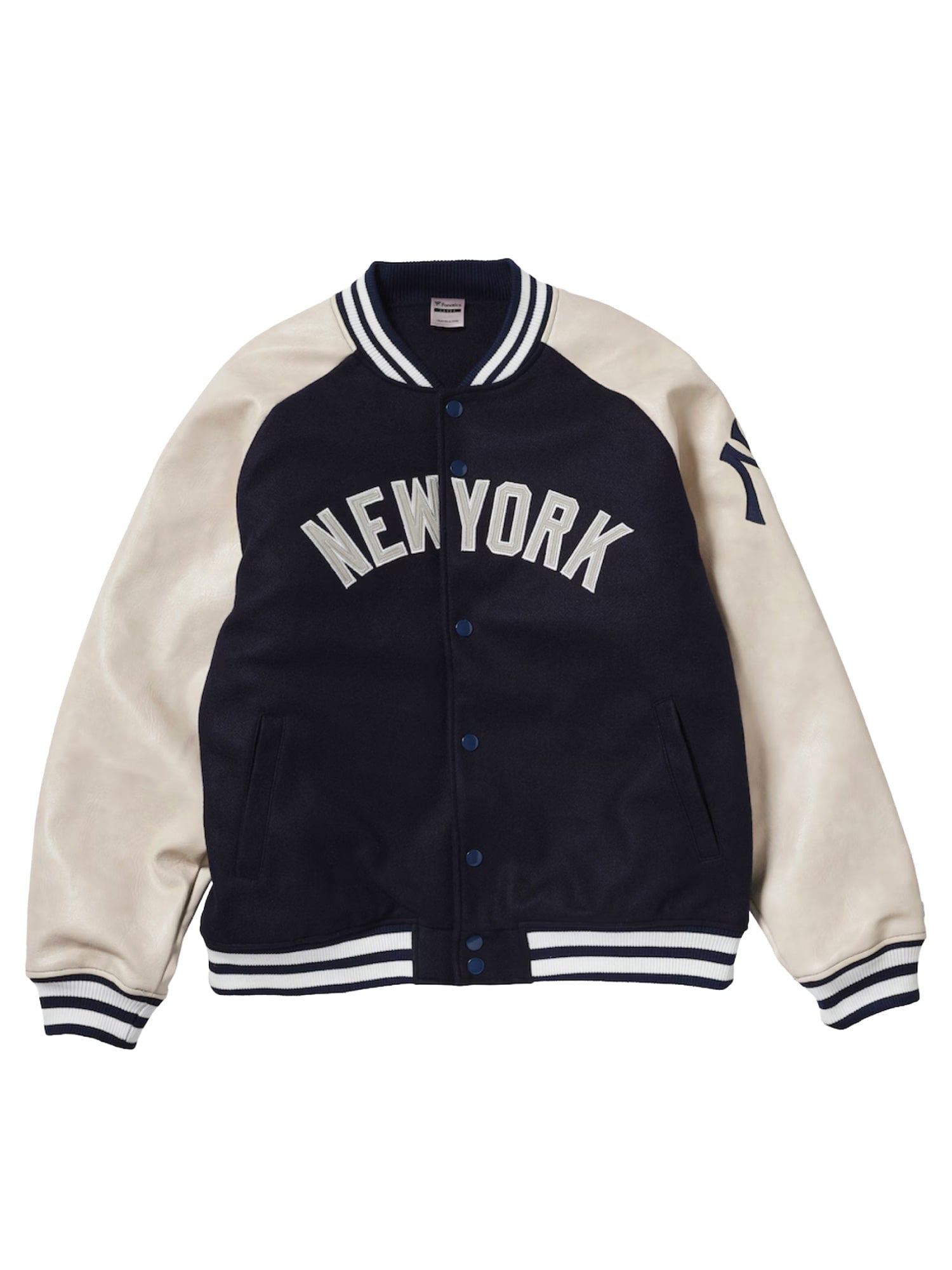 フロントにはクラシックな“NEW YORK”アーチロゴ、左袖にはNYロゴをあしらい、王道のバーシティスタイルを再現した一着です。