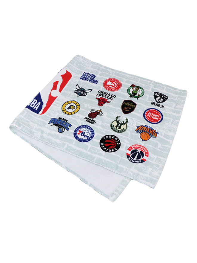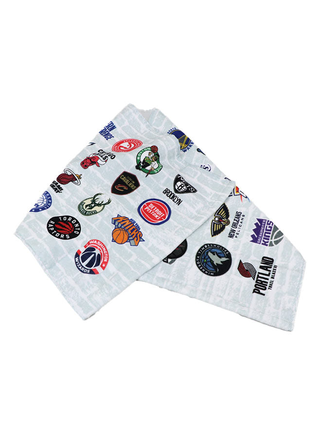 NBA30チームのロゴをバランスよくレイアウトした、爽やかなホワイトベースのフェイスタオル。