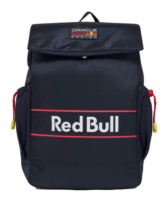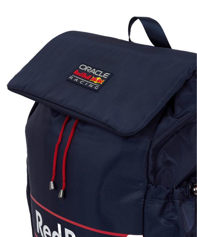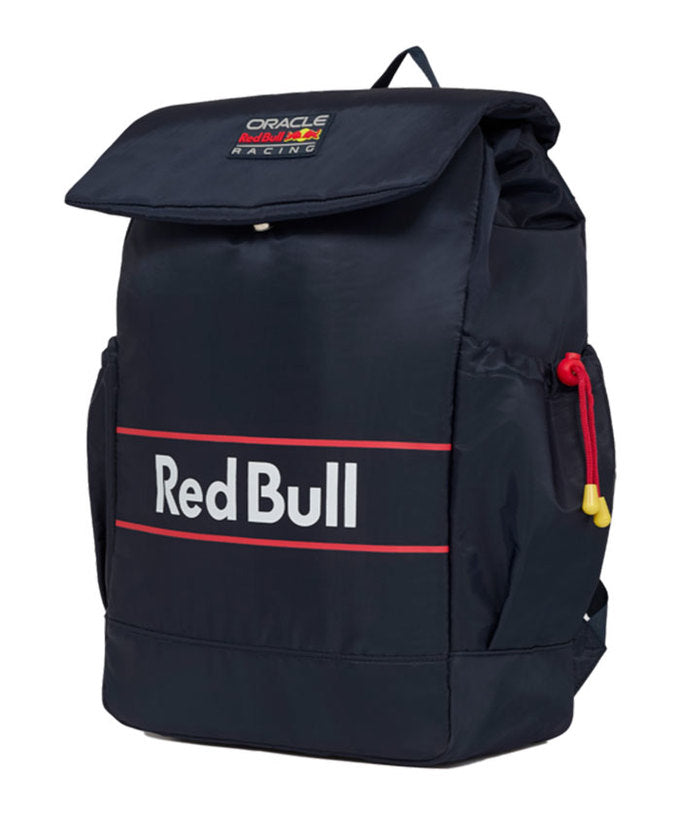深みのあるネイビーカラーを基調に、フロントの“Red Bull”ロゴが印象的。フラップ上部にはオラクル レッドブル レーシングのチームパッチが施されています。