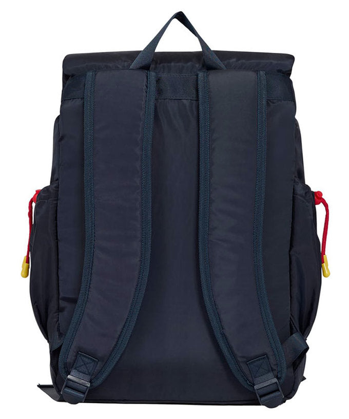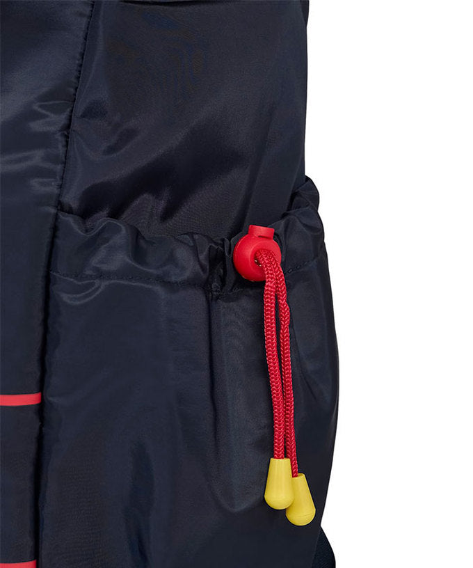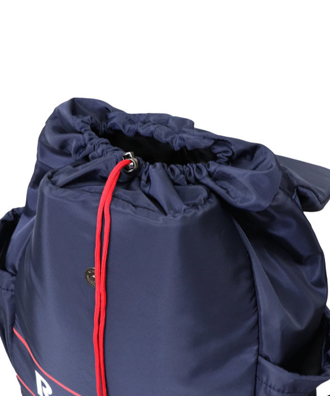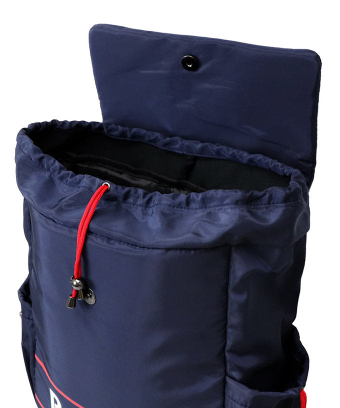 開閉はドローストリングとフラップ式の二重構造で、荷物の飛び出しを防止。両サイドにはボトル等を収納できるドローストリングポケットを備え、通学・通勤・観戦・旅行など様々なシーンに対応します。