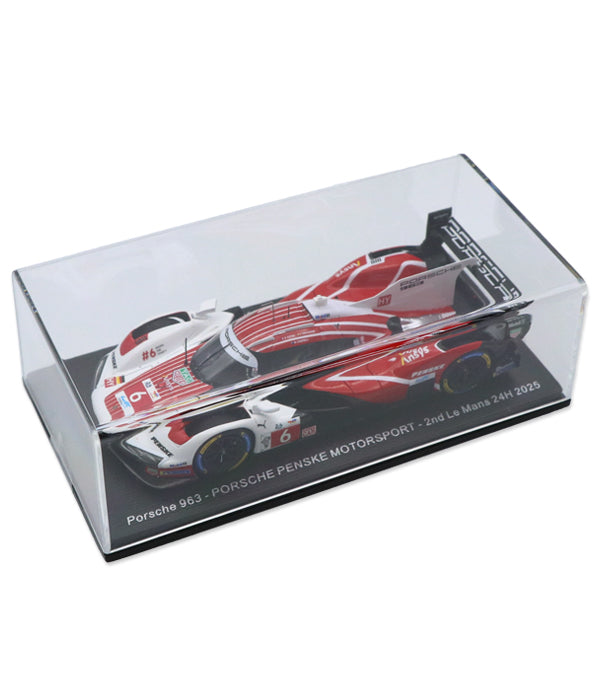 ポルシェ・ペンスキー・モータースポーツが2025年ル・マン24時間レースで2位入賞を果たした、ポルシェ963 No.6を再現したモデルカーです。ケビン・エストーレ、ローレンス・ファントール、マット・キャンベルの3名がドライブしました。