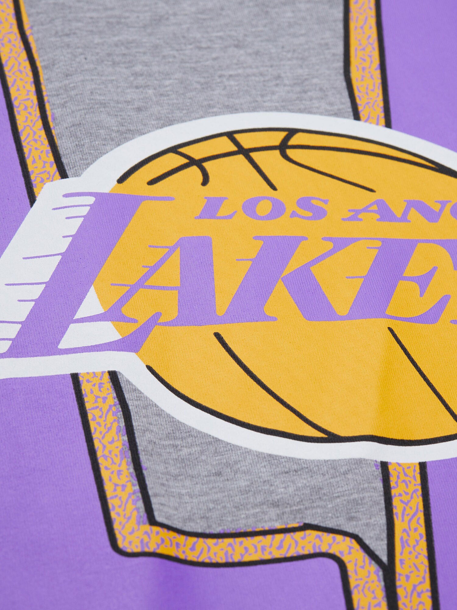 フロントにはLAの象徴であるパープル&ゴールドのレタリングと、クラシックなレイカーズロゴを大胆にデザイン。どこか懐かしい雰囲気を残しつつ、ストリートでも映えるレトロテイストの一枚です。