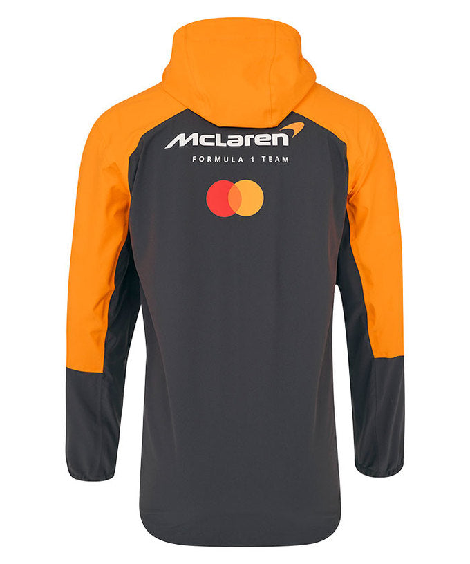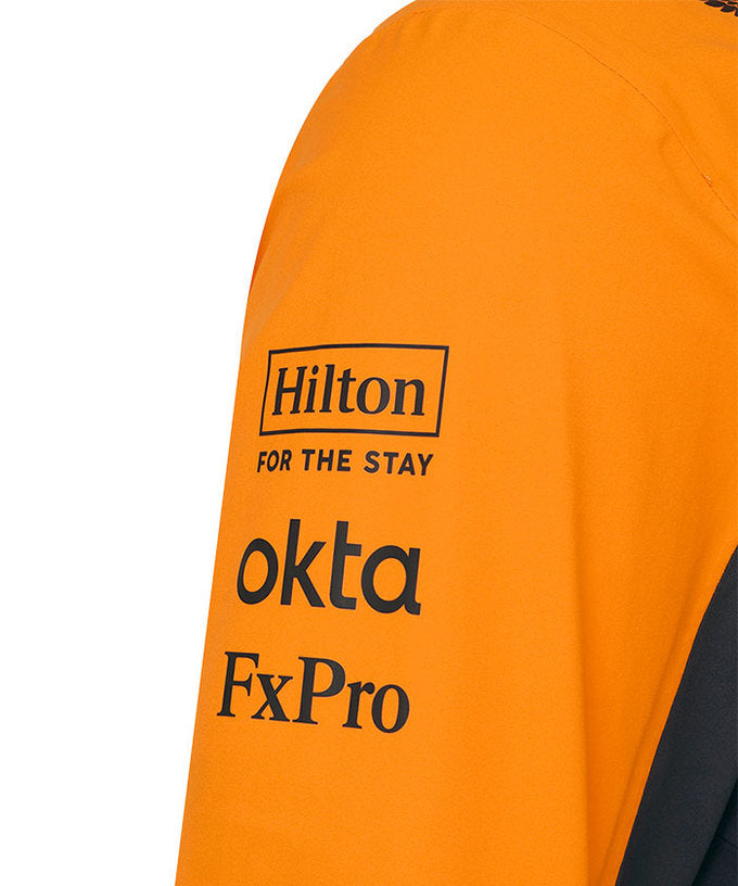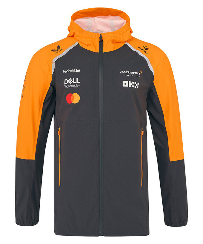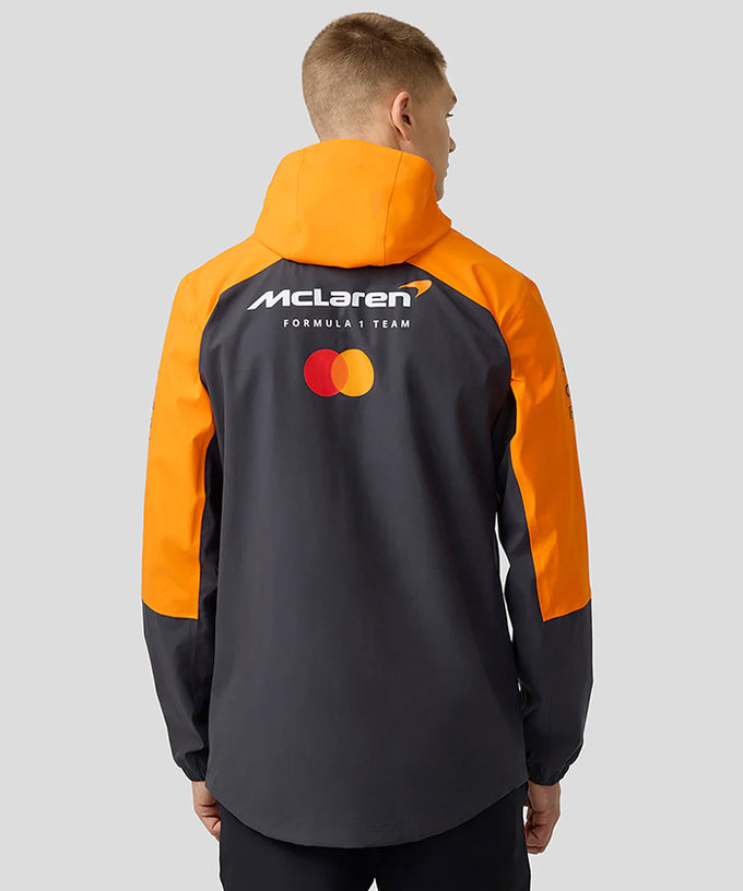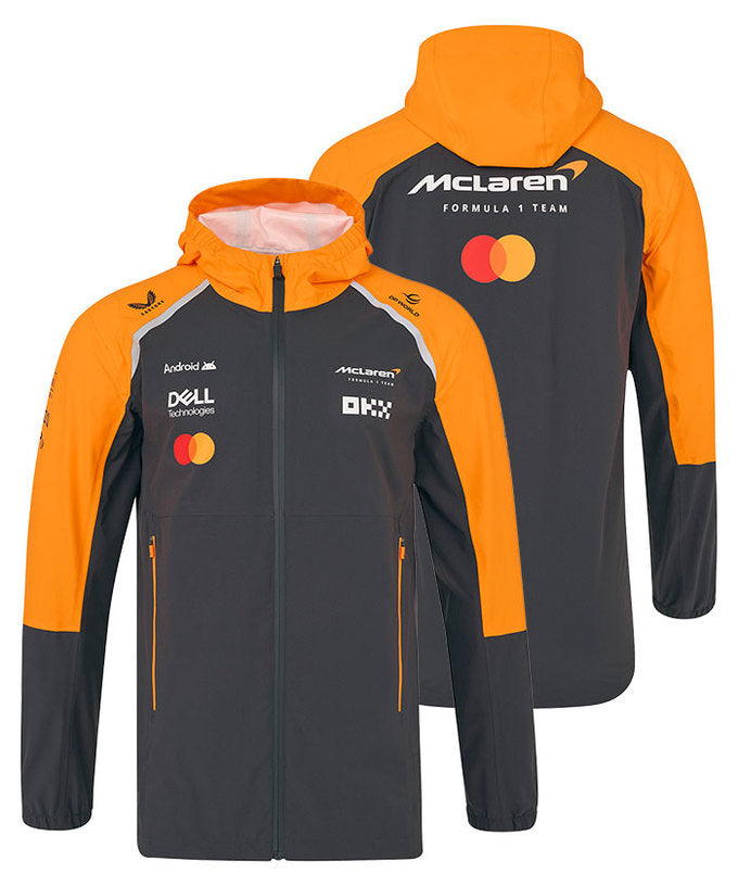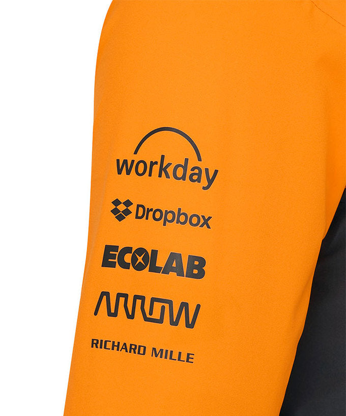 マクラーレン・フォーミュラ1チーム公式ユニセックス・ウォータープルーフレインジャケットは、3ピース構造のピークドフードと専用トグルアジャスターにより、どんな天候にも対応できる。セットインされた長袖は、ゴム入りの袖口でオフセットされ、保温性を提供する。その他の部分でも、センターフロントのフル防水ジッパーが要素から比類のないプロテクションを提供する。ジャケットのリフレクティブ・シルバー・テーピングは、暗い場所でも視認性を保つ。さらに、アウトドアウェアのサイドには大きなジップポケットが付いている。