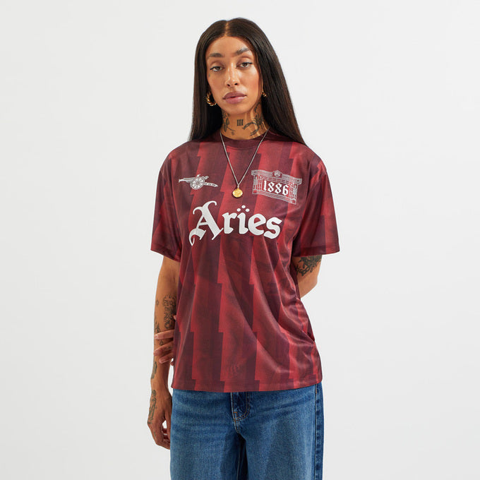 アリーズロゴ、レトロな大砲、ハイベリー風寺院のグラフィックがあしらわれた、90年代風のボルトストライプデザインのTシャツ。レギュラー(ユニセックス)フィットのため、ゆったりサイズをご希望の方は普段よりワンサイズ上をおすすめします。