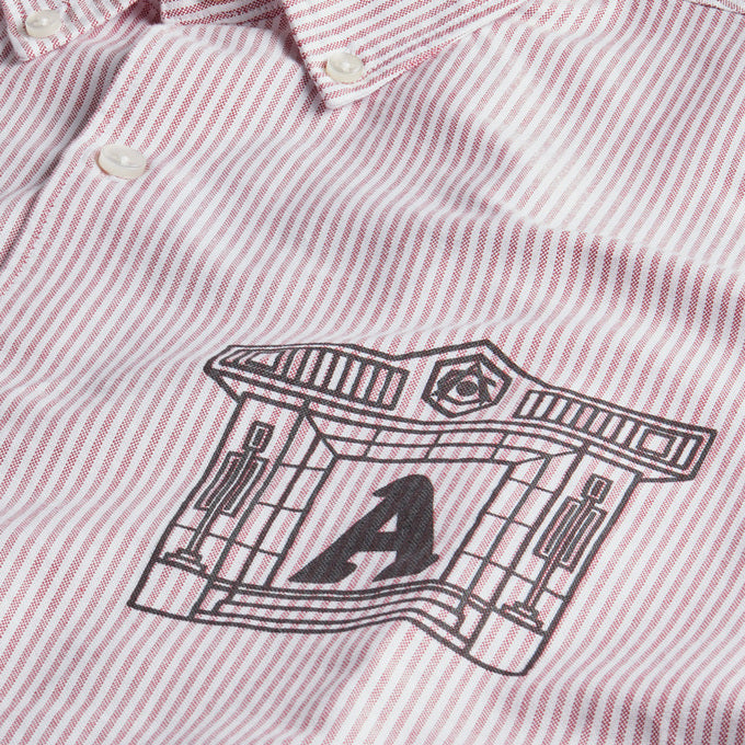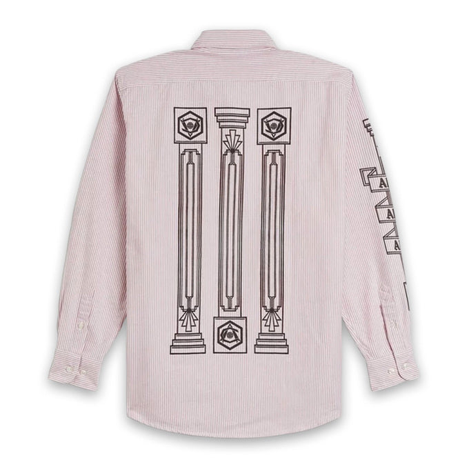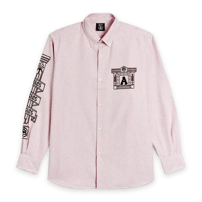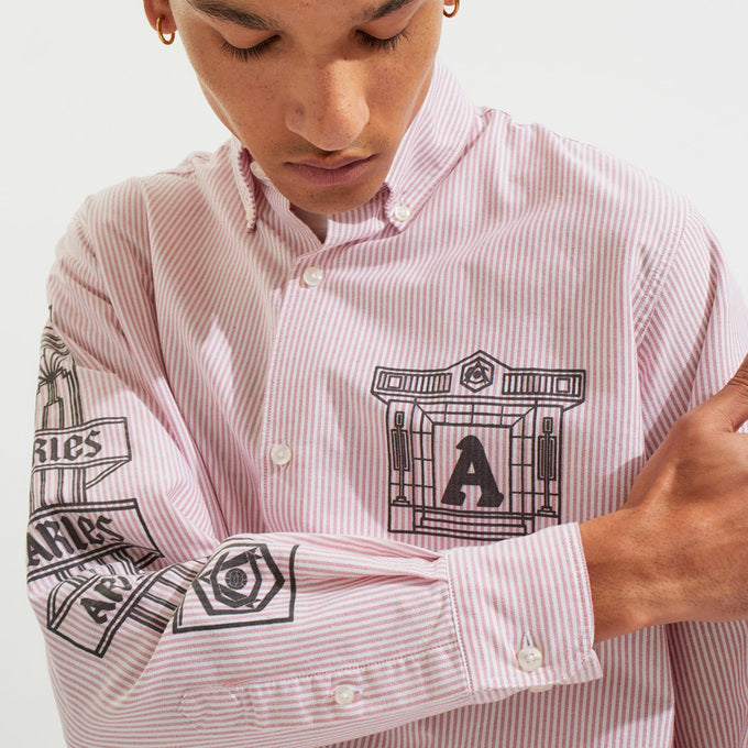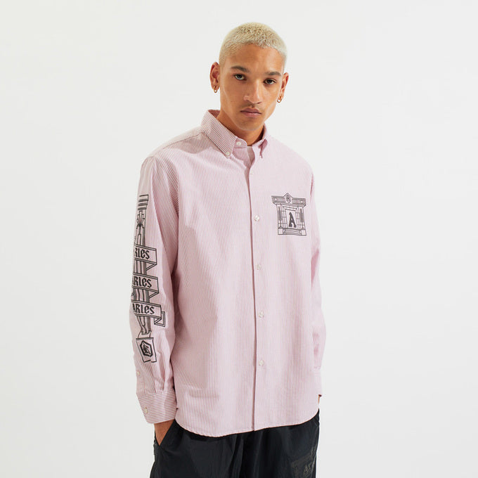アリーズの特徴的なコラムデザインによるハイベリー風寺院や柱のグラフィックがプリントされた長袖シャツ。一日中着ても快適なユニセックスフィットです。