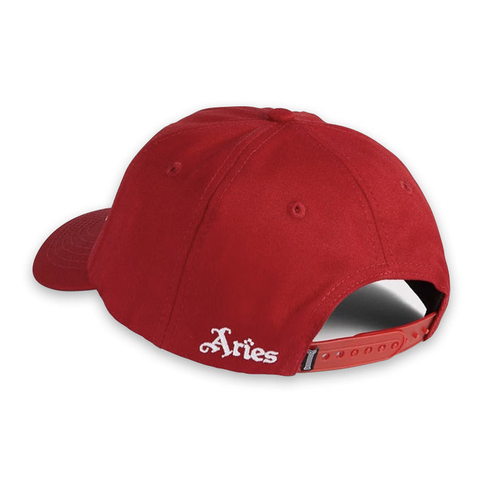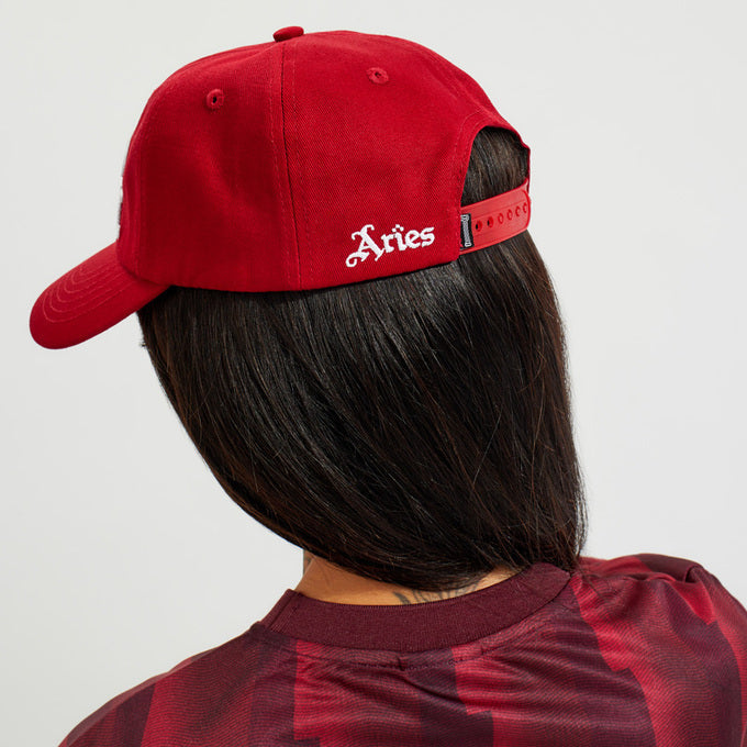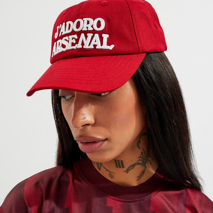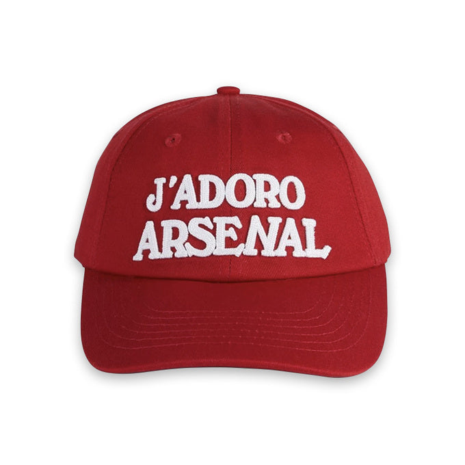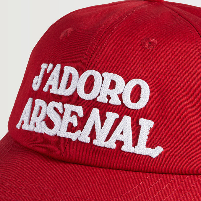 フロントにチェーンステッチの「J'Adoro Arsenal(アーセナル大好き)」刺繍入りキャップ(レッド)。